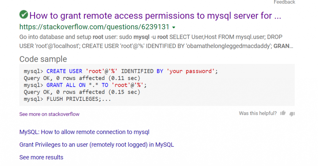 This I found on the web – it works for me – I was able to connect up to a mysql database running on another windows computer in my network.