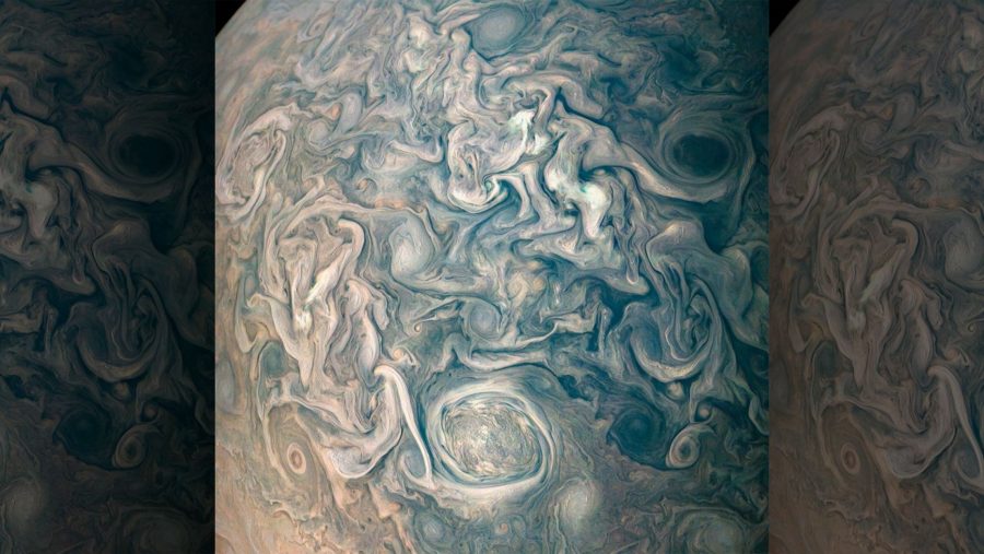 “The region seen here is somewhat chaotic and turbulent, given the various swirling cloud formations,” NASA said on its website. “In general, the darker cloud material is deeper in Jupiter’s atmosphere, while bright cloud material is high. The bright clouds are most likely ammonia or ammonia and water, mixed with a sprinkling of unknown chemical ingredients.”